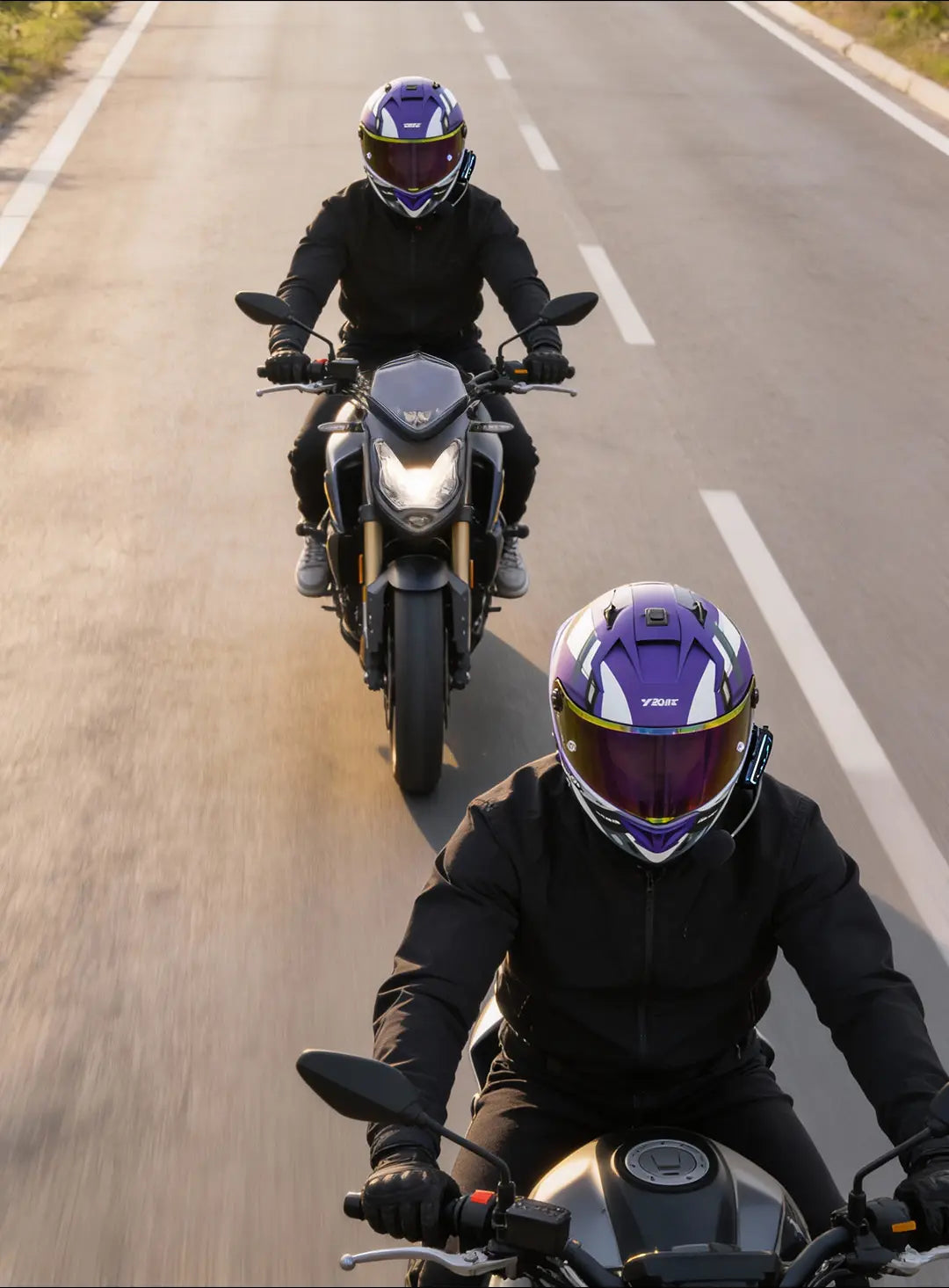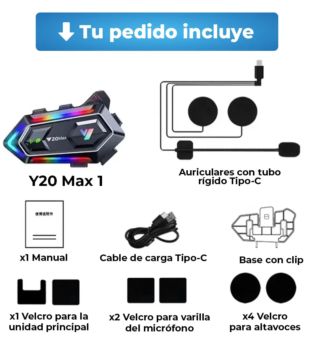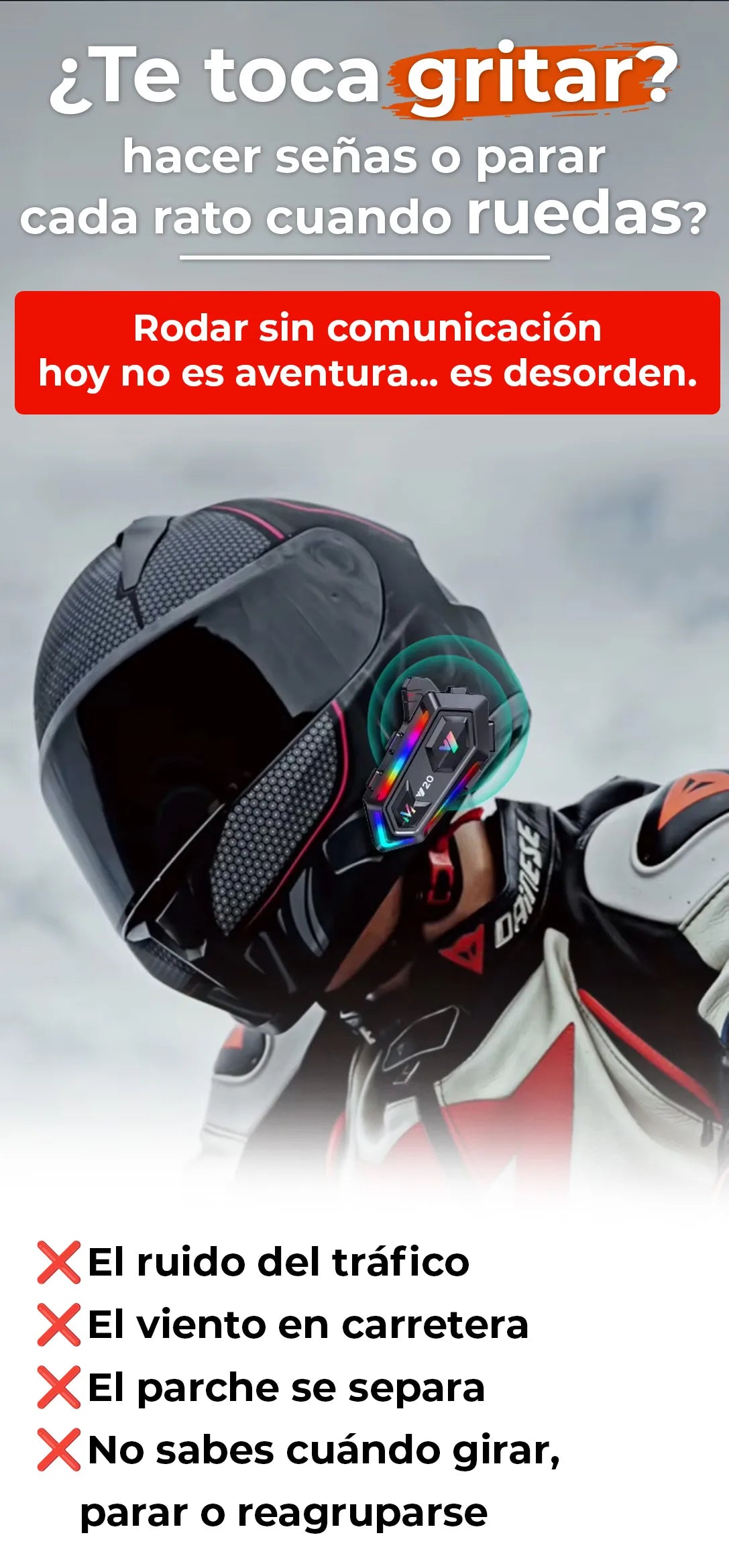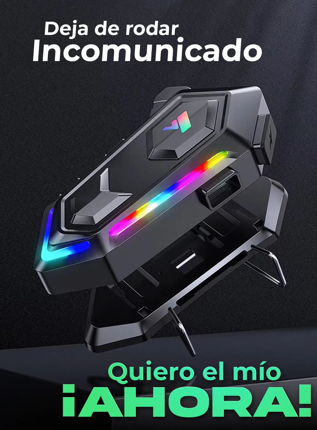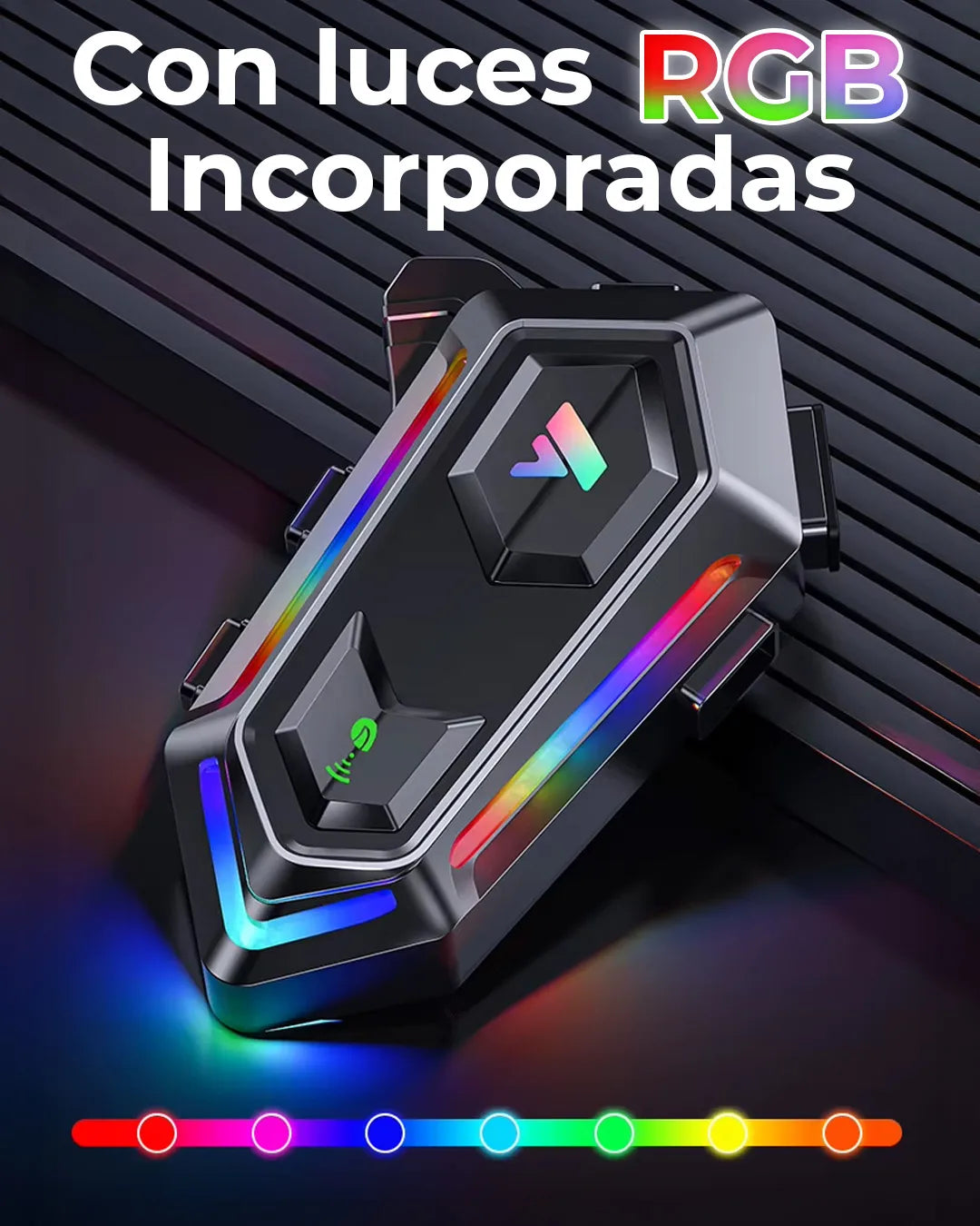 Intercomunicador Bluetooth para moto con conexión grupal, manos libres y luces RGB para rodar con estilo y control.