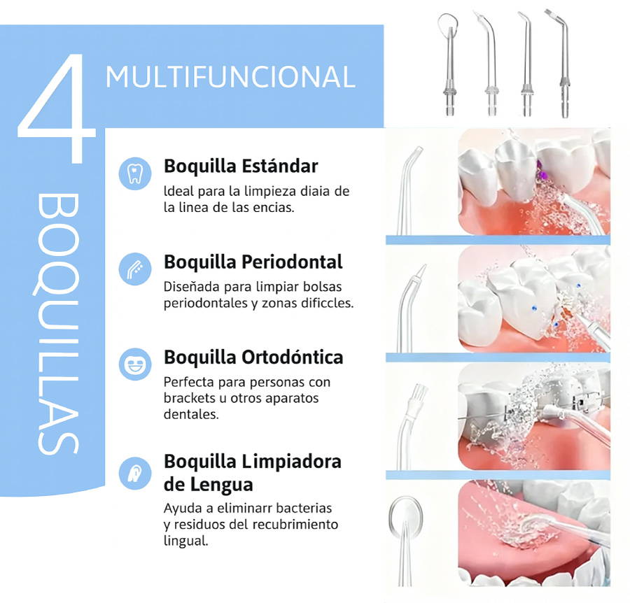 ✅ Súper simple: 1) Llena el depósito. 2) Elige tu modo. 3) Dirige la boquilla entre tus dientes. Tarda solo 60 segundos