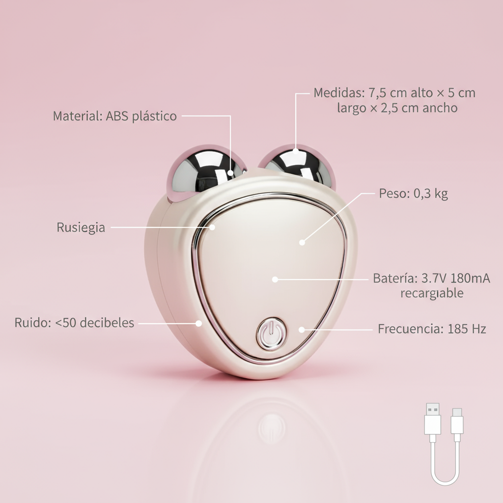 Las esferas metálicas y la vibración ayudan a activar la circulación, drenar líquidos y relajar músculos faciales. Úsalo con pases suaves de adentro hacia afuera y de abajo hacia arriba.